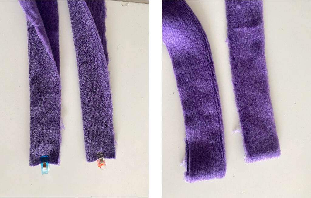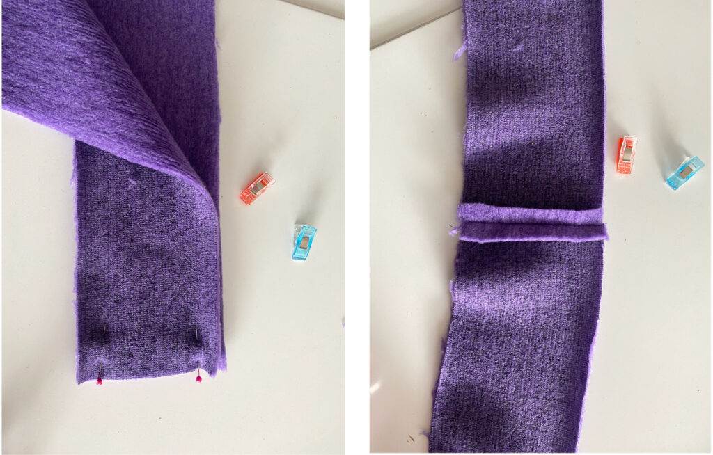 Jetzt die Blende mit etwas mehr als die gewünschte fertige Blendenbreite mit einer Hilfsnaht* zusammennähen (Bei mir gewünschte Breite 3,5cm > ca. 3,8cm zusammennähen). Dann die überstehende Nahtzugabe knapp (3mm) zurückschneiden. Durch diesen Arbeitsschritt hast du jetzt eine saubere Schnittkante, die nun ganz einfach an die Ausschnittkante deiner Jacke gesteckt werden kann und die gewährleistet, dass du alle drei Lagen ordentlich beim Zusammennähen fasst.