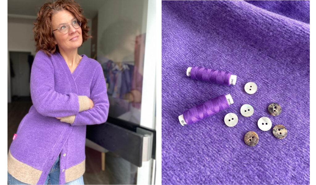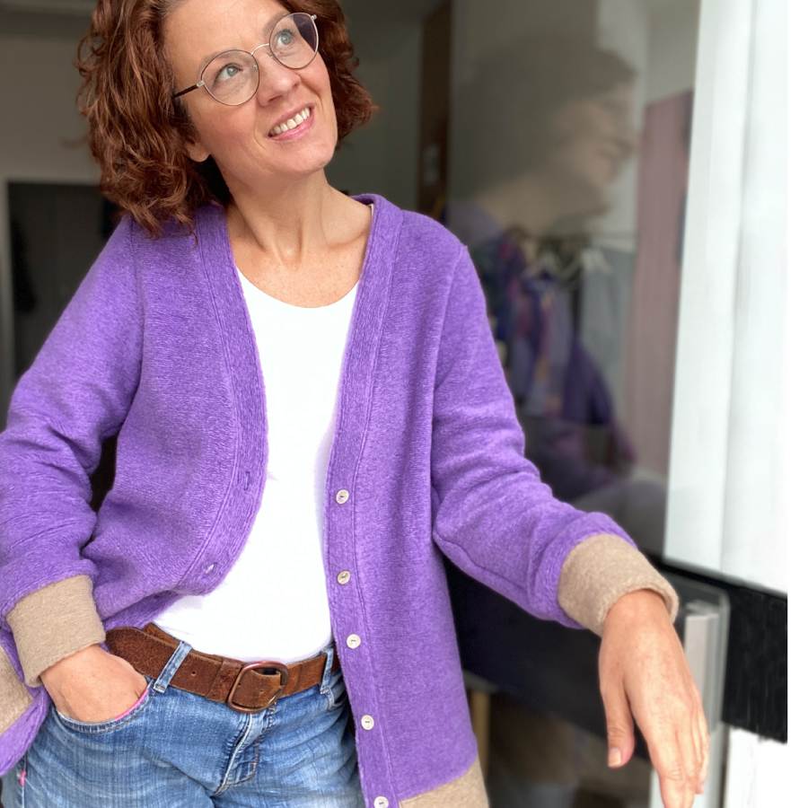 Lana Cotta wird auch als „Kochwolle“ bezeichnet, was die Art der Herstellung schon gewissermaßen erklärt. Das ursprüngliche Gestrick (meist eine Mischung aus Wolle und Polyester u.ä.) erhält durch Kochen bzw. Behandeln mit heißem Wasser seine typische verfilzte Oberfläche. Durch das Verfilzen franst das Gestrick nicht mehr aus und kann offenkantig verarbeitet werden. Die Dehnbarkeit behält Lana Cotta trotz der Verarbeitung, was den Tragekomfort erhöht. Durch die Beimischung mit künstlich hergestellten Fasern, wird das Material pflegeleichter, in der Grammatur leichter und kostengünstiger als Wollwalk aus 100% Wolle. Lana Cotta eignet sich für leichte Jacken, Westen und alle Modelle die man üblicher Weise aus Sweatstoff nähen kann. Du musst dich nur entscheiden, ob du ein Material mit Wolle an deinem Körper leiden magst (Wobei mein Lana Cotta überhaupt nicht kratzt!), oder ob dich der künstliche Anteil zu sehr stört, um ein daraus genähtes Bekleidungsstück direkt auf deiner Haut zu tragen.