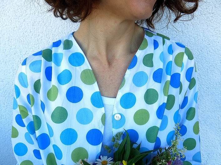 JETZT war er fällig. Blöder Weise hatte Frau wieder nicht den richtigen Stoff dafür vorrätig. Aber was muss, dass muss – und zwar sofort. Also hab ich einen Baumwollstoff (Viskose wird empfohlen) aus meinem Vorrat genommen, der eigentlich für eine Tunika gedacht war. So ist aus der Bluse Bellah eher ein Jäckchen Bellah geworden.