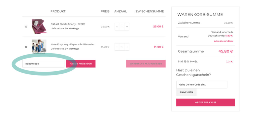 Wenn alles funktioniert hat, wird der Rabatt direkt rechts bei der Warenkorb-Summe angezeigt bzw. abgezogen.