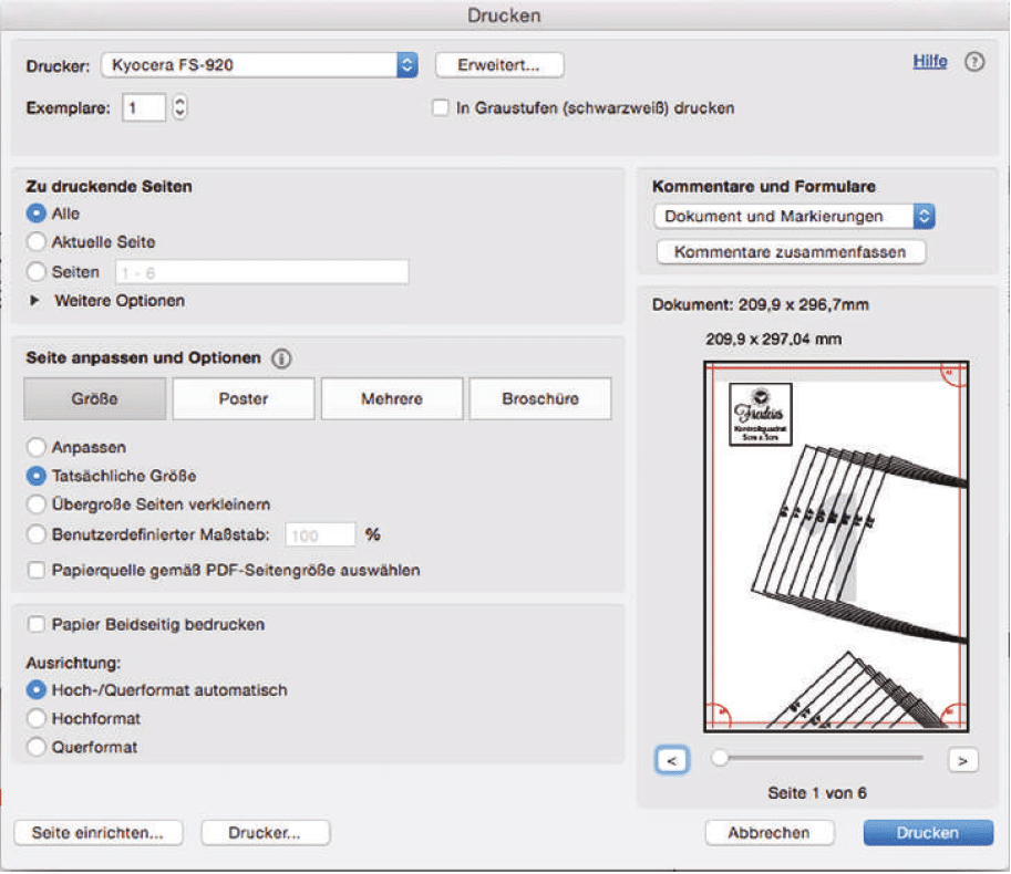 Um Papier zu sparen habe ich die Kleberänder der einzelnen Blätter so knapp wie möglich, aber so breit wie nötig angelegt. Bitte öffne deine Schnittmuster-PDF mit dem Programm Adobe Reader (kostenloser Download hier) und stelle bei den Druckeigenschaften „Tatsächliche Größe“ ein.