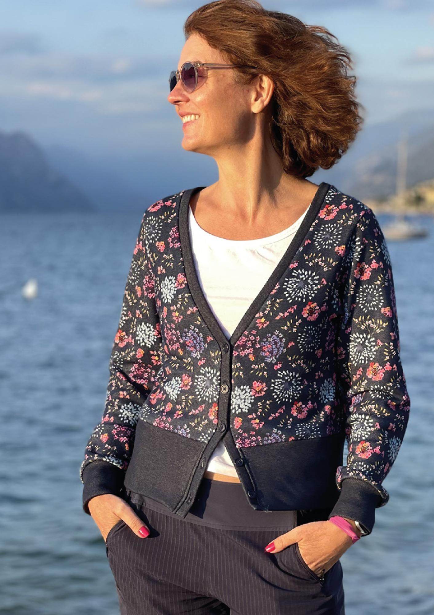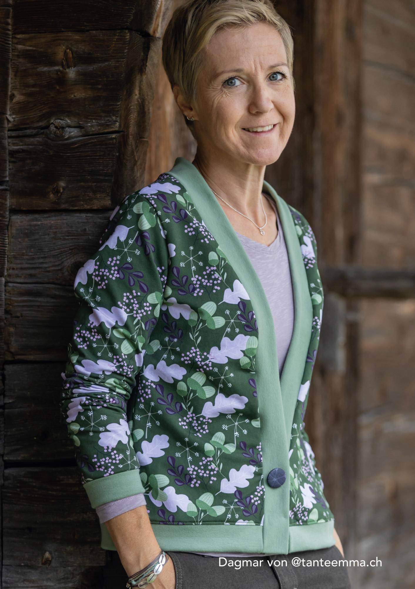 Die Jacke ist leger geschnitten, aber nicht körperfern. Dadurch kann sie auch bei kühleren Temperaturen unter einer dickeren Jacke/Mantel getragen werden. Konzipiert ist das Basic-Jäckchen für dehnbare, etwas voluminösere Stoffe wie Sweat, Jerseyjacquard oder Frenchterry. Das Schnittmuster beinhaltet zwei Längen mit jeweils einer Bundbreite: kurze Jacke = breiter Bund, längere Jacke = schmalerer Bund. Es kann komplett aus einem Stoff genäht werden. Die Bündchen und der Einfassstreifen können aber auch aus Bündchenware genäht werden.