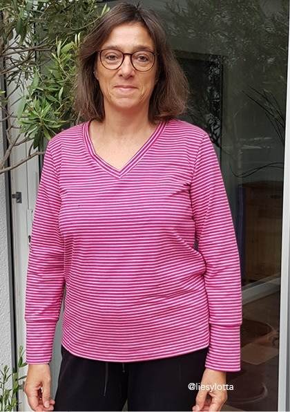 Ich habe meinen ersten V-Ausschnitt genäht( kaufe alles mit V) , mich nie rangetraut aber mit dieser Anleitung, hat er direkt beim ersten Mal TIPTOP geklappt und vor allem auch so ausgesehen. Habe den mittleren Ausschnitt genommen, musste nichts kürzen, wunderbar!!