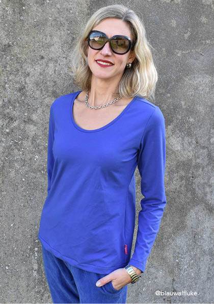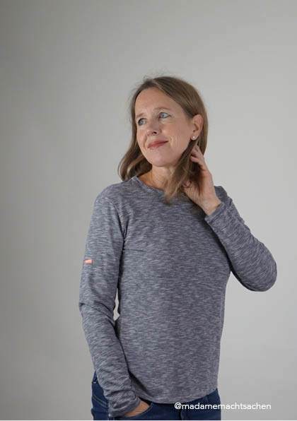 Im Schnittmuster vom BASIC-SHIRT sind drei Ausschnitttiefen und Kurz- und Langarm enthalten. Damit kannst du dich für jede Saison einkleiden. Die kurze Nähanleitung findest du direkt auf dem Schnittmuster.