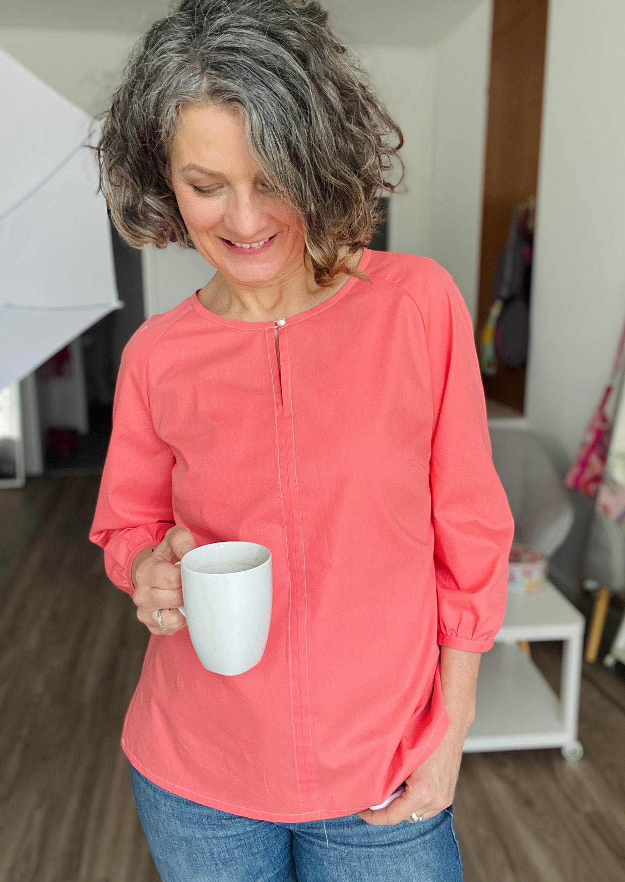 Die besondere Schnittführung der Raglanärmel (zwei Längen zur Auswahl) und der kleine Schlitz in der vorderen Mitte machen die Bluse zum Hingucker. An den Seitennähten hat die Bluse ebenfalls Schlitze, deren Verarbeitung du aus drei Varianten wählen kannst.