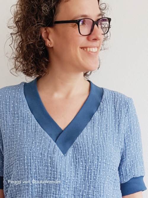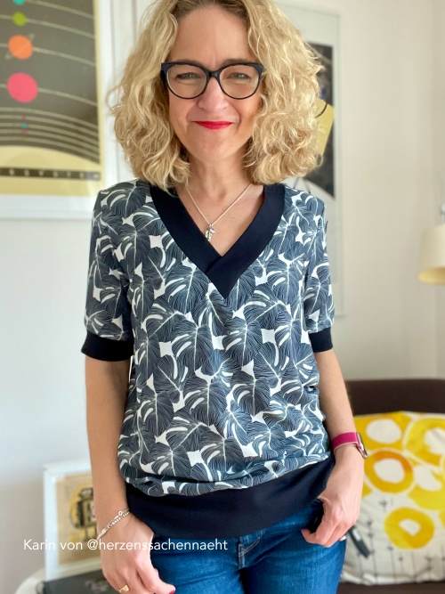 Wie gewohnt passt der Schnitt sehr gut. Mit der detaillierten Videoanleitung ist der V-Auschnitt gut gelungen, obwohl ich zum ersten Mal so einen Ausschnitt genäht habe. Er legt sich super an Hals und Dekolleté. Das macht der perfekte Schnitt der Halsblende.
