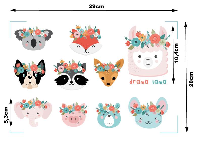 Du bekommst einen Bogen mit 10 süßen Tierportraits, unterschiedlicher Größen.