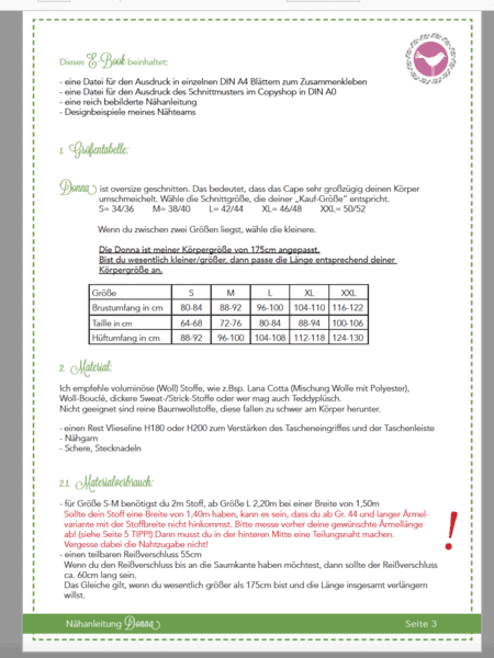 - gedrucktes Mehrgrößenschnittmuster (Gr. S-XXL), keine überlappenden Schnittteile per Post