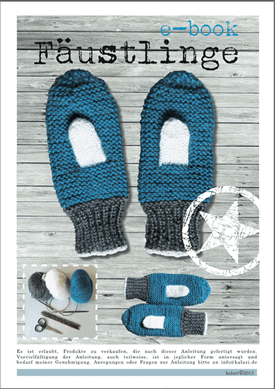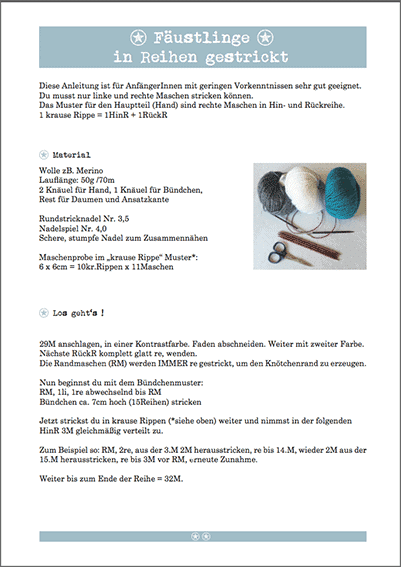 Ausreichend für ein Paar Fäustlinge sind 2 Knäuel Wolle 50g/70m für das Handteil und 1 Knäuel für die Bündchen, für die Daumen reichen kleine kleine Wollreste.