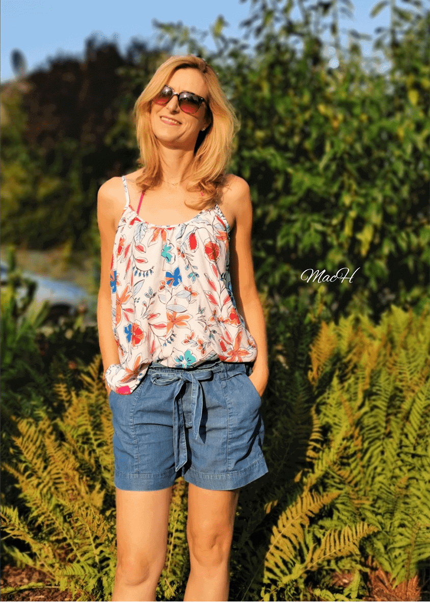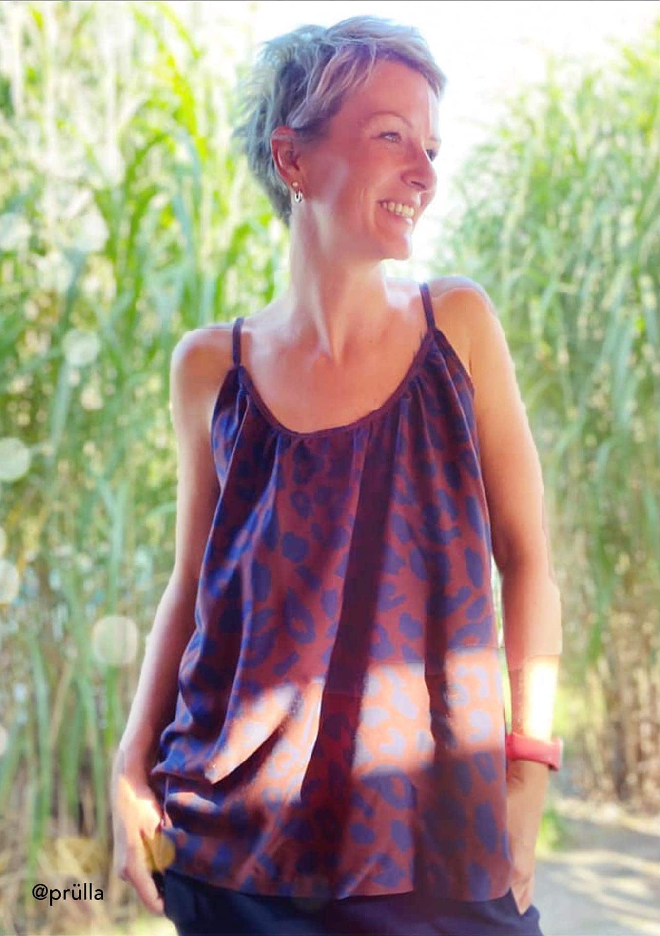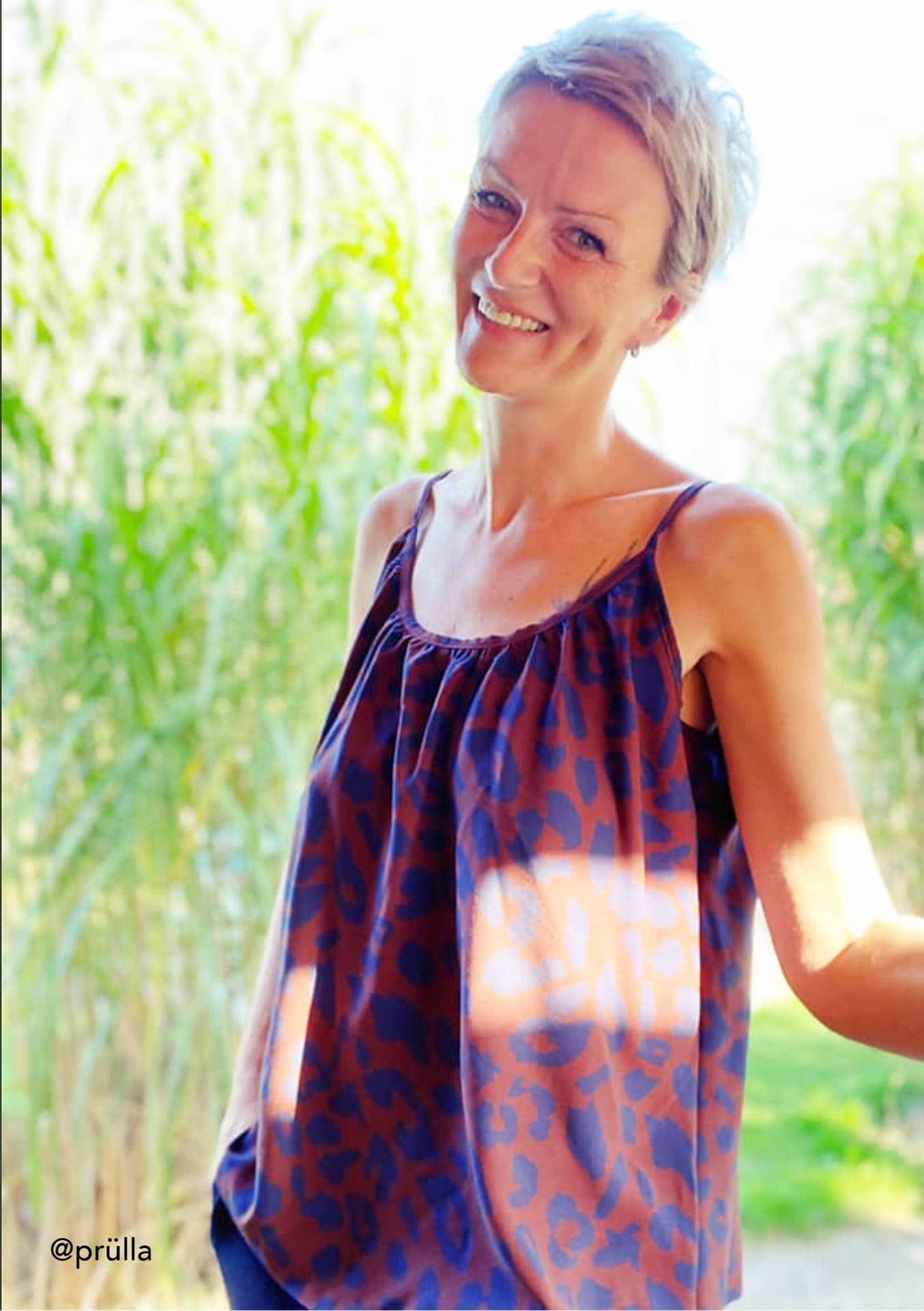 Sanny sollte aus feiner, zarter Webware (Viskose, Viskosekrepp, Chiffon, Georgette oder Musselin) genäht werden, damit das Hemdchen schön schwingen kann. Weniger geübten Näherinnen empfehle ich Musselin, da sich Viskose & Co. beim Zuschneiden und Nähen doch schon mal von ihren „zickigen“ Seiten zeigen können und Musselin griffiger ist.