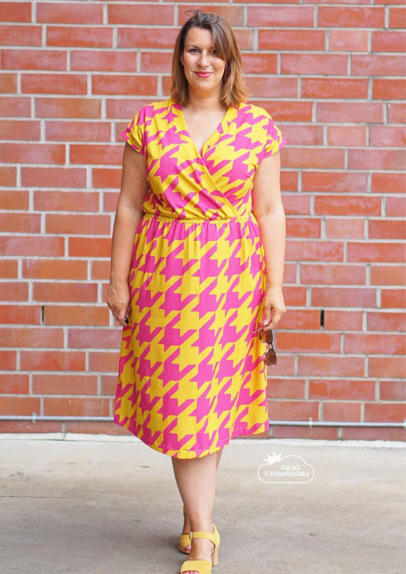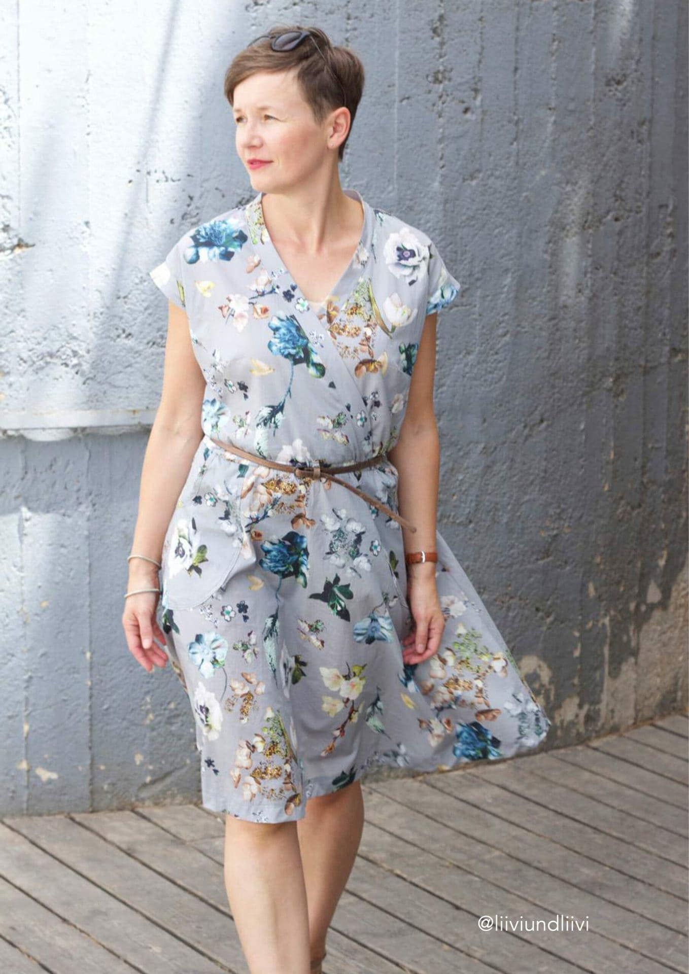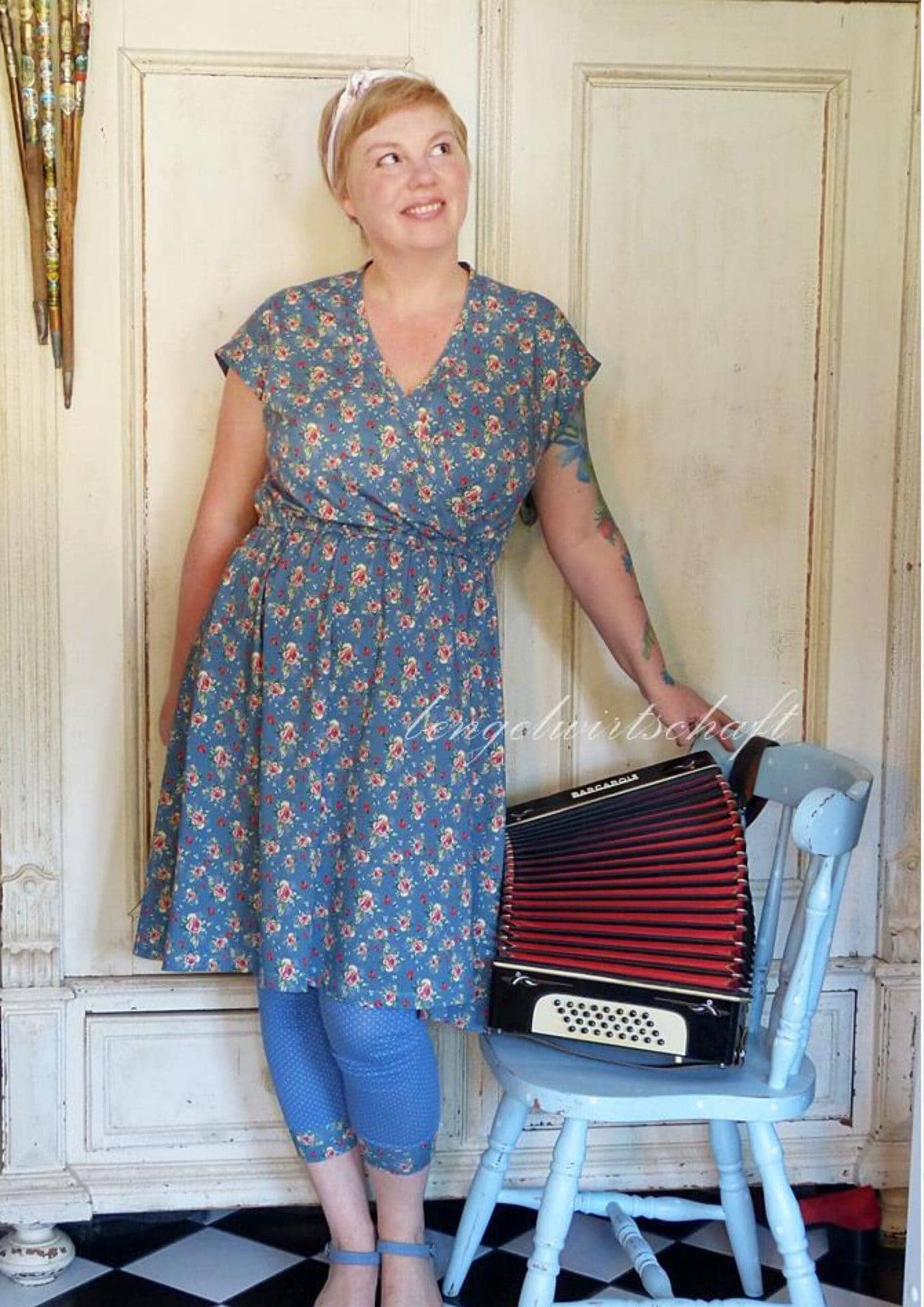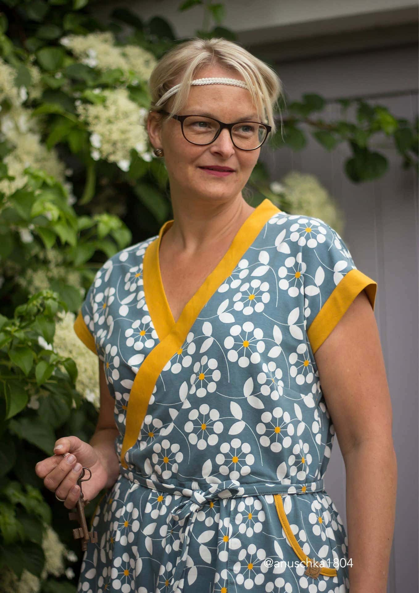 Ich habe mein Kleid Katrein mit engerer Rockvariante aus wunderbarer Baumwollpopeline genäht. Der Zuschnitt ( mit NZG) und das Nähen nach der detaillierten, bebilderten Anleitung war unkompliziert. Der Halsausschnitt mit Wickeleffekt liegt gut an und ist nicht zu tief . Auch die aufgesetzten Taschen sind schön und praktisch. Obwohl ich kein Fan von Taillengummi bin, ist dieser sehr angenehm zu tragen. Ich nähte den optionalen breiteren Gürtel mit Knopflöchern, was einen sehr schönen Effekt gibt, aber auch mit schmalem Ledergürtel sieht das Kleid Katrein super aus .