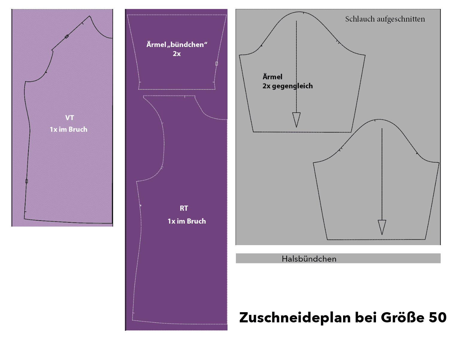 VT+RT kannst du direkt im Bruch zuschneiden. Für die Ärmel musst du den Schlauch aufschneiden (siehe Zuschneideplan).