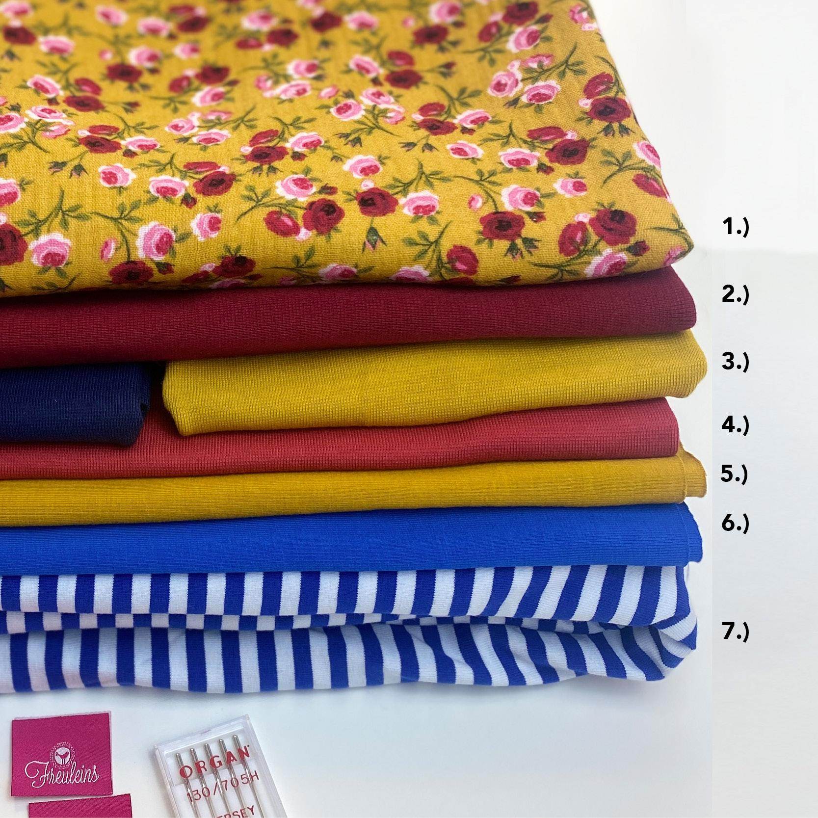 Hier haben wir für dich ein großes Set zusammengestellt, aus dem du 2-3 Shirts (je nach Modell), 3 Mützen und ein großes Musselin-Tuch nähen kannst.