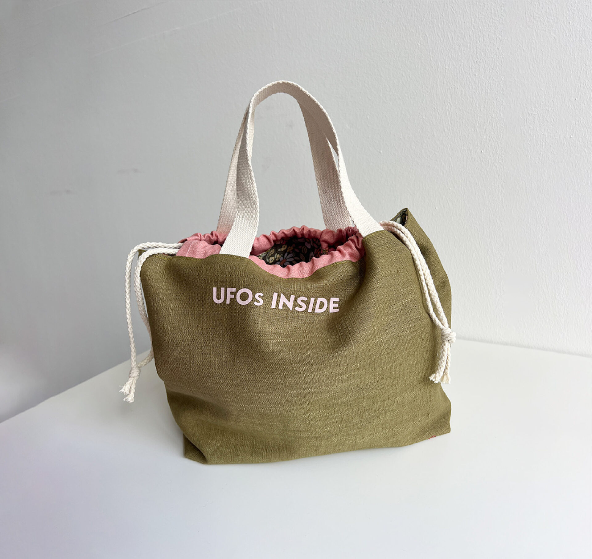 (Vorderseite: KNIT.KNIT.HURRA!, Rückseite: UFOs INSIDE)