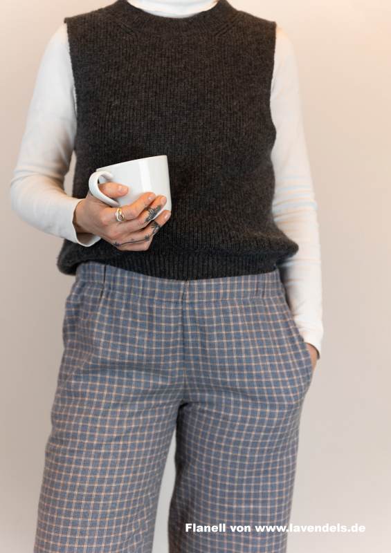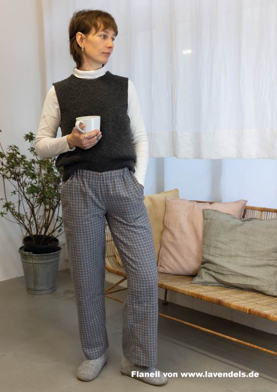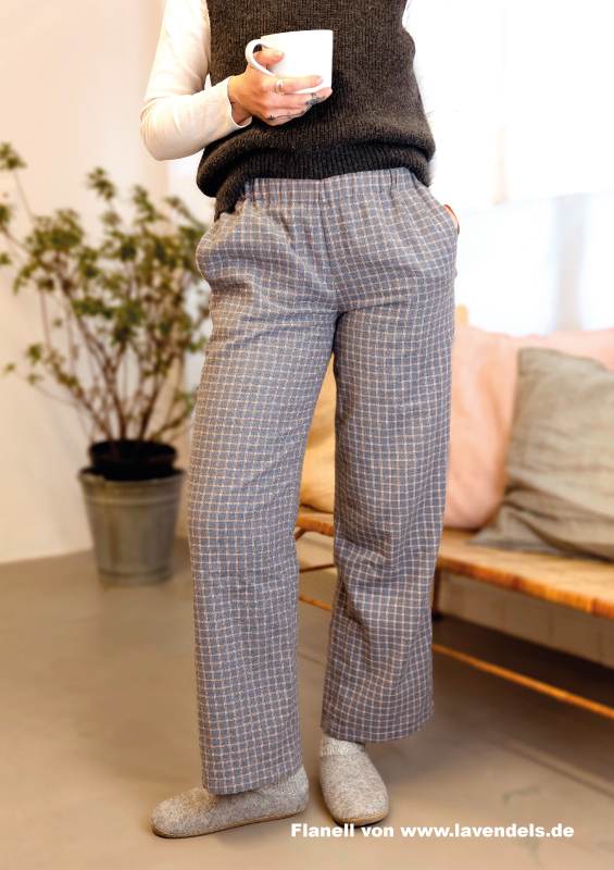 Konzipiert ist die Pyjamahose für Webware wie z.Bsp. Flanell, Musselin, Frottee oder Waffelpique.