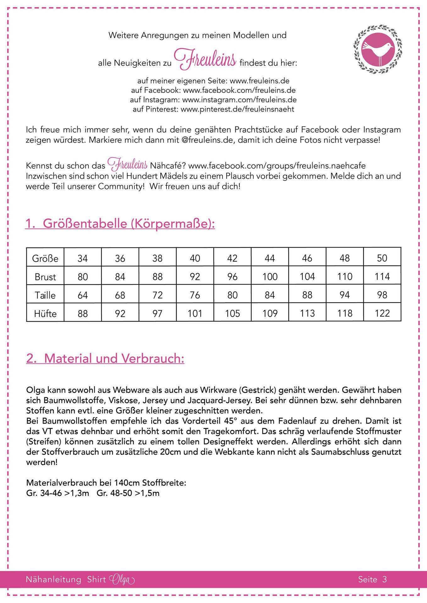 Gr. 34-46 >1,3m   Gr. 48-50 >1,5m Papierschnittmuster Shirt Olga