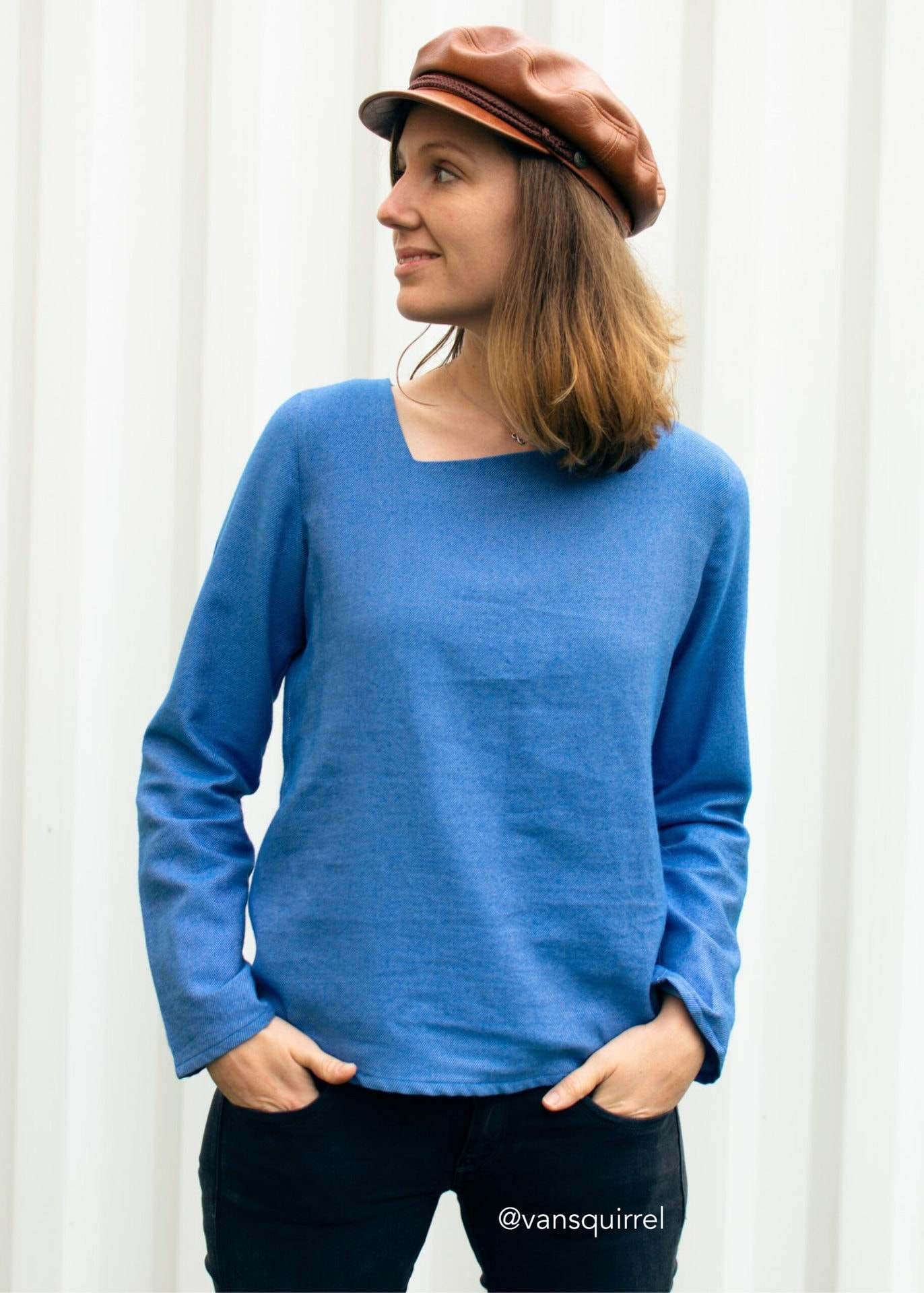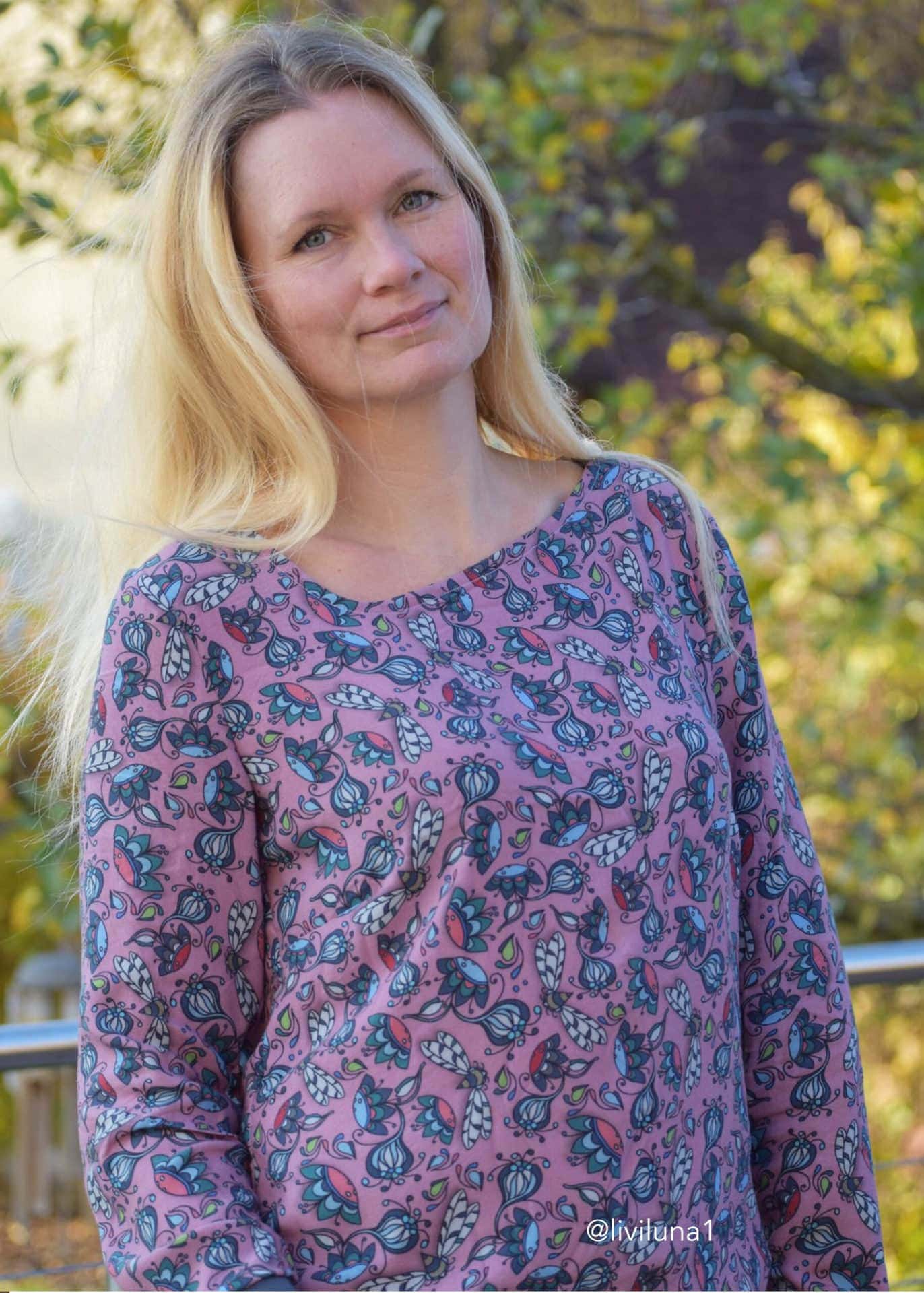 Olga kann sowohl aus Webware als auch aus Wirkware (Gestrick) genäht werden. Gewährt haben sich Baumwollstoffe, Viskose, Jersey und Jacquard-Jersey. Bei sehr dünnen bzw. sehr dehnbaren Stoffen kann evtl. eine Größer kleiner zugeschnitten werden.