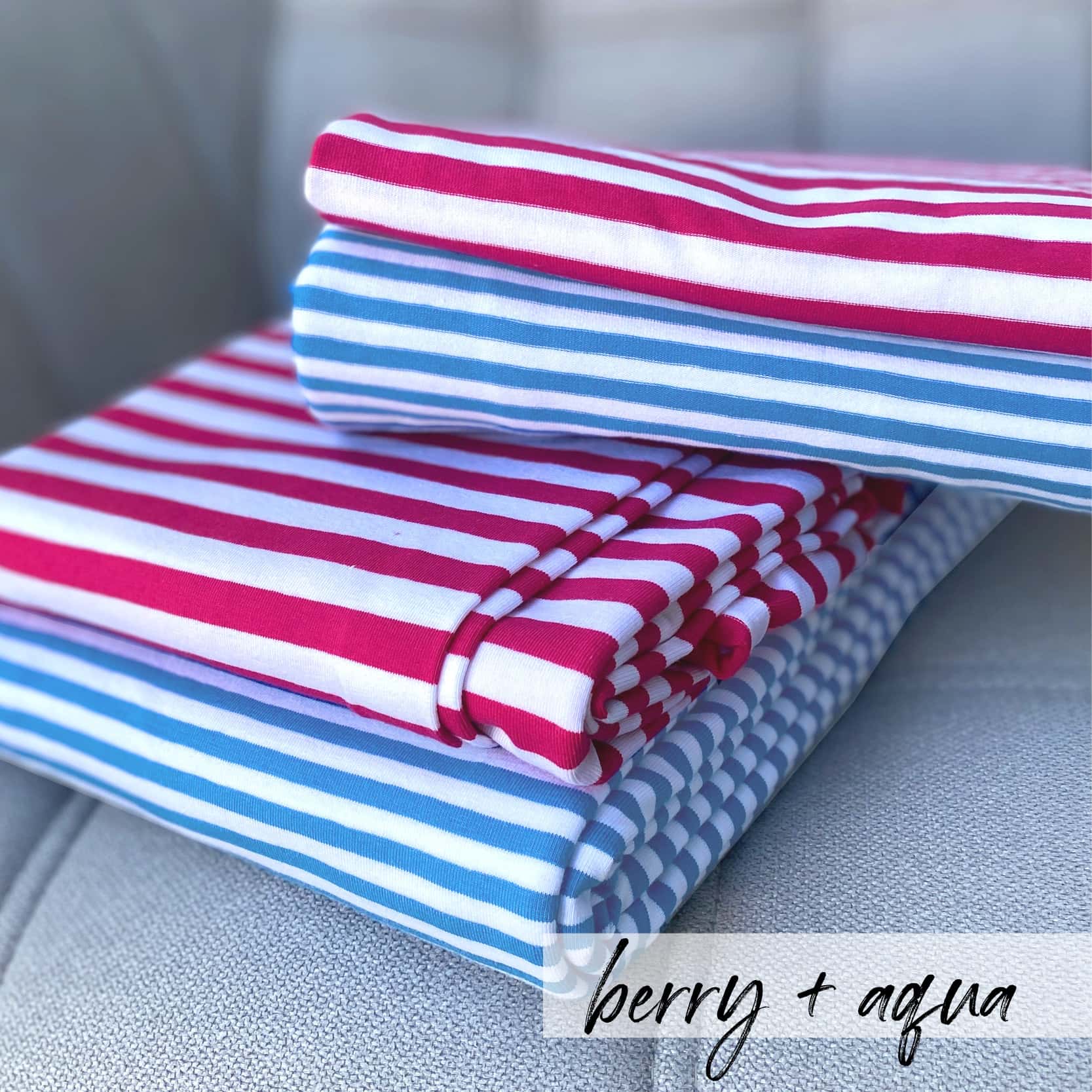 Im Stoffpaket sind jeweils zwei verschiedene Farben, ggf. auch unterschiedlich breite Streifen. Jedes Stoffstück ist mindestens 1,2m lang, ausreichend für je ein Kurzarmshirt – zum Beispiel Basic Shirt 1 oder Basic Shirt 2 (nicht im Stoffpaket enthalten). Du könntest also 2 unterschiedliche Shirts aus jedem Stoffpaket nähen.