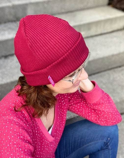 Natürlich kann Frau eine Mütze aus dem Bündchen genau so tragen.