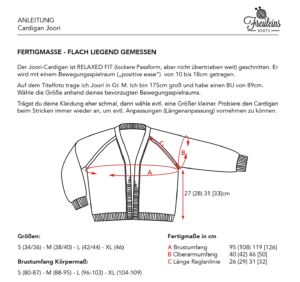 Der Joori-Cardigan ist Relaxed Fit (lockere Passform, aber nicht übertrieben weit) geschnitten. Er wird mit einem Bewegungsspielraum („positive ease“) von 10 bis 18cm getragen.