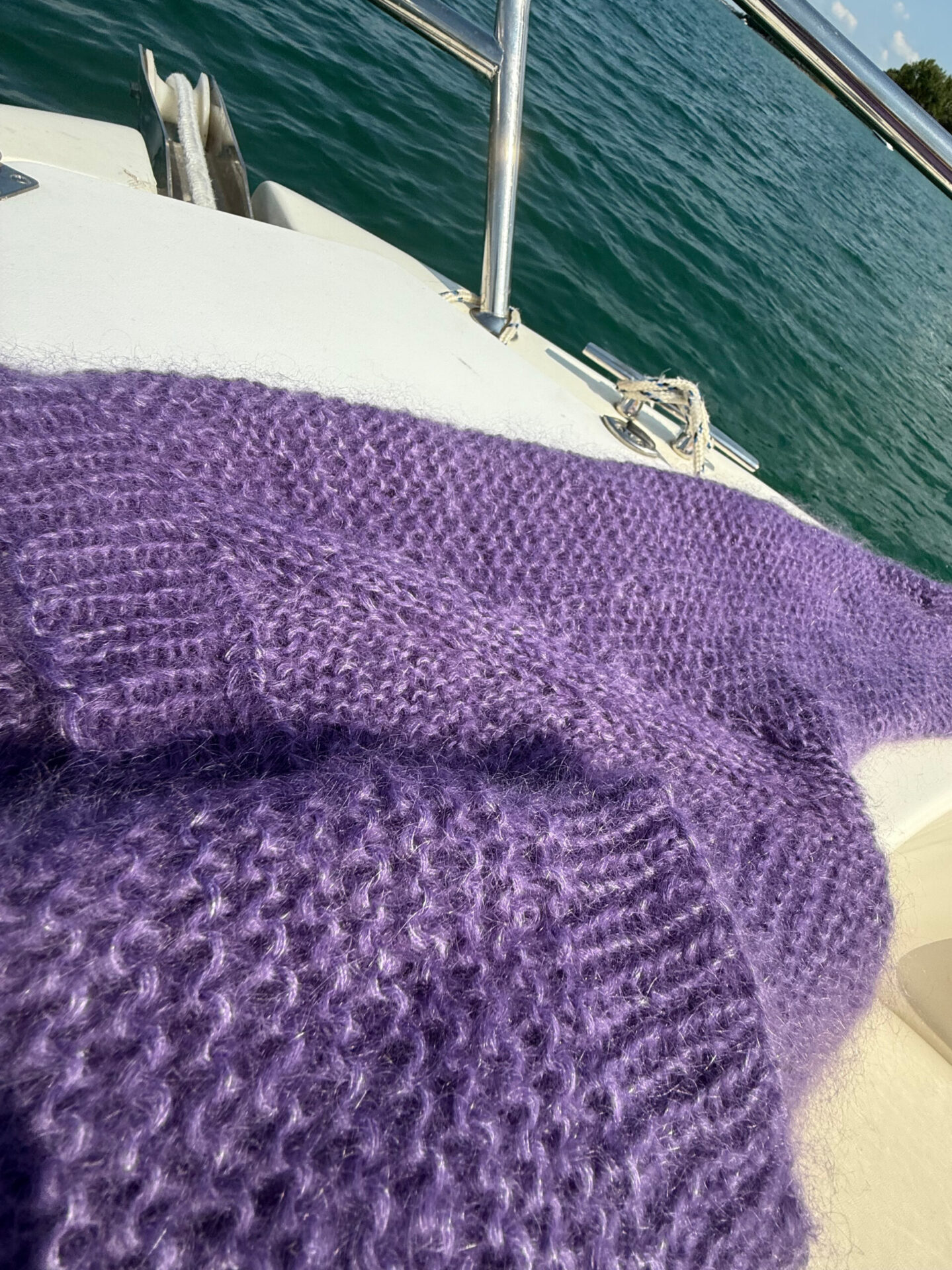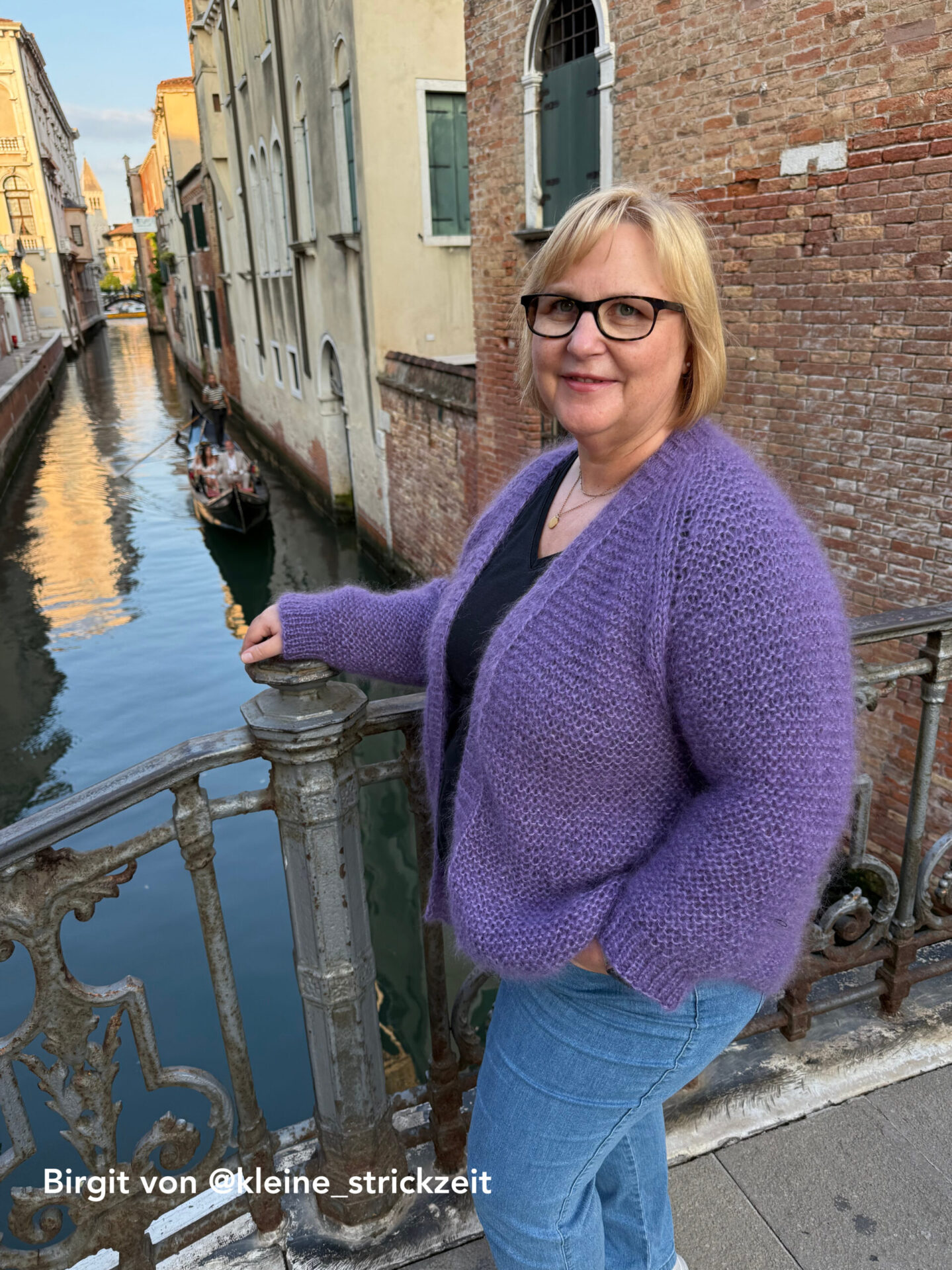 Das Strickset beinhaltet je nach Größe (S= 10 Knäuel, M+L= 12 Knäuel, XL= 14 Knäuel) einer Farbe. Die Wolle wird 4fädig mit einer 8er Nadel (nicht im Set enthalten) gestrickt. Birgit hat den Cardigan in Gr. XL in der Farbe Lila gestrickt, allerdings etwas verlängert (16Knäuel).