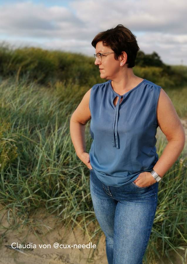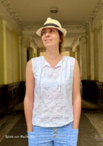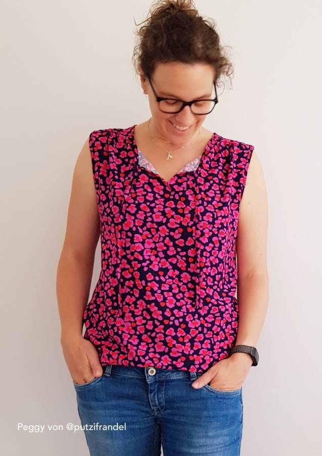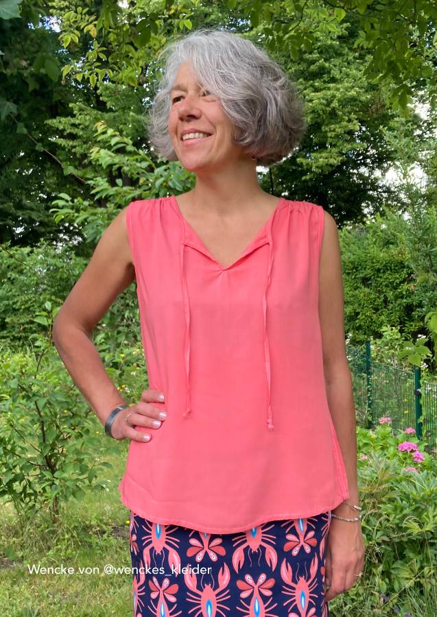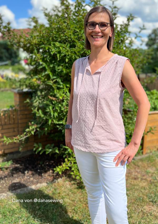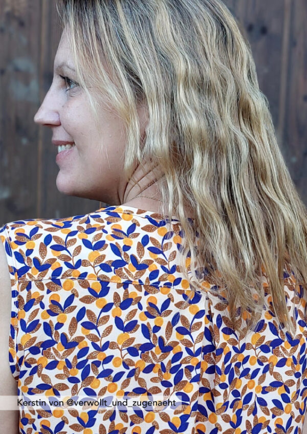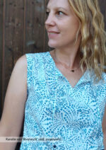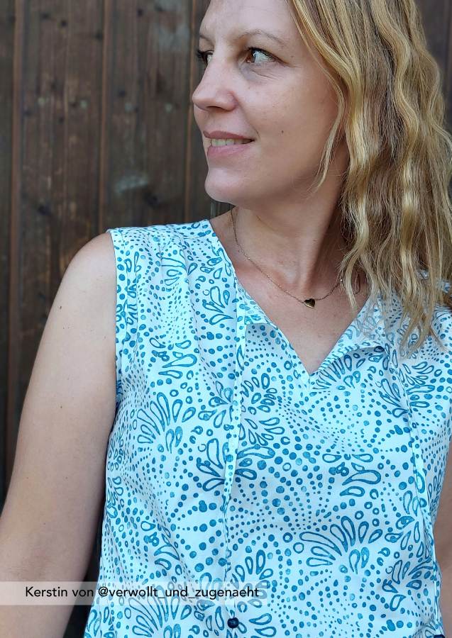 Konzipiert ist das Top für luftige Sommerstoffe wie Krepp, Crinkle, Viskose/Rayon, Musselin, Batist, weich fallender Baumwollstoff etc., die für ein angenehmes Tragegefühl sorgen. Da der Ausschnitt sicherlich offen getragen wird und damit die linke Stoffseite nach außen klappt, sollten die Stoffe entweder uni oder die Muster gewebt sein. Bei bedruckten Stoffen sieht man die unschöne (unbedruckte) linke Seite.