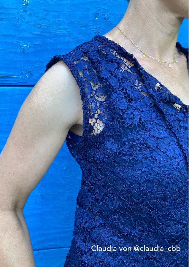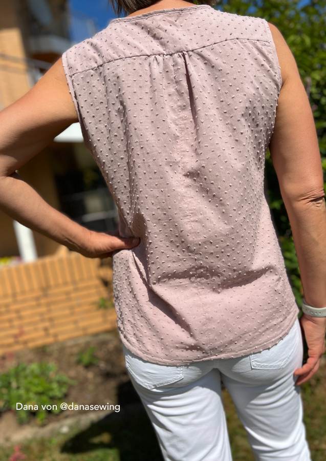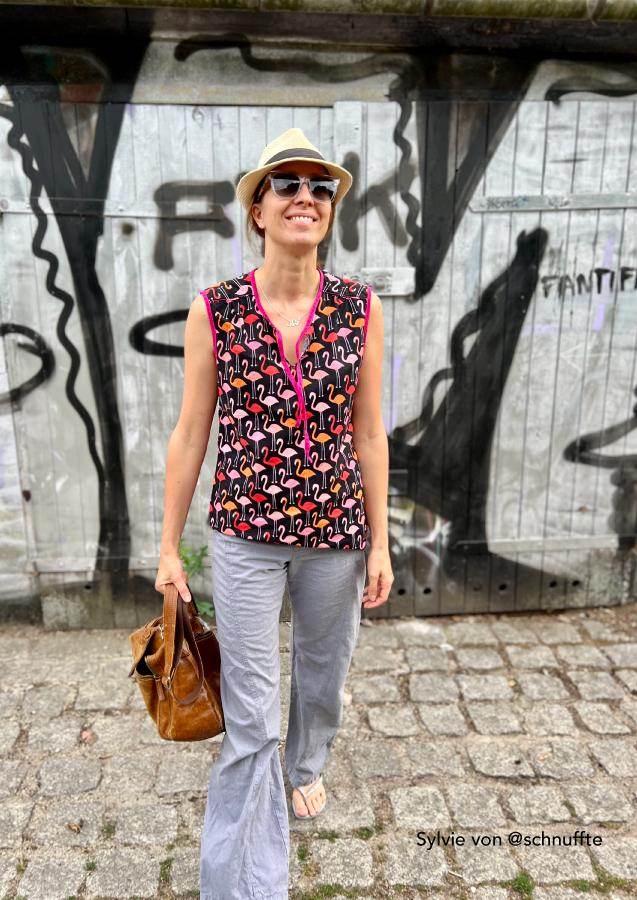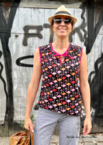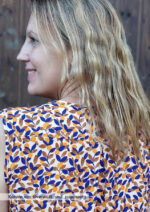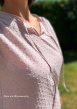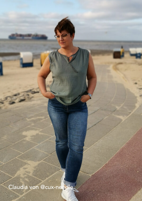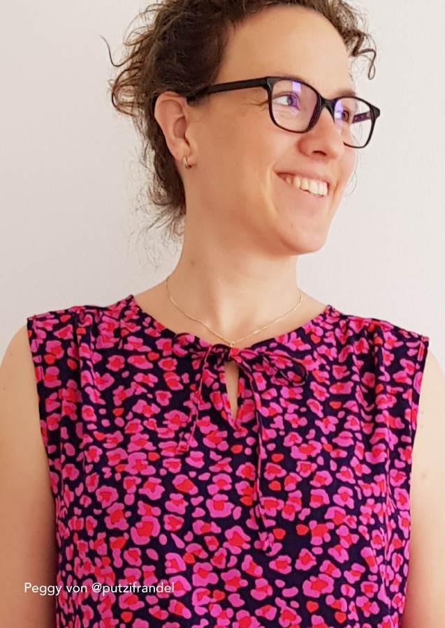 Konzipiert ist das Top für luftige Sommerstoffe wie Krepp, Crinkle, Viskose/Rayon, Musselin, Batist, weich fallender Baumwollstoff etc., die für ein angenehmes Tragegefühl sorgen. Da der Ausschnitt sicherlich offen getragen wird und damit die linke Stoffseite nach außen klappt, sollten die Stoffe entweder uni oder die Muster gewebt sein. Bei bedruckten Stoffen sieht man die unschöne (unbedruckte) linke Seite.